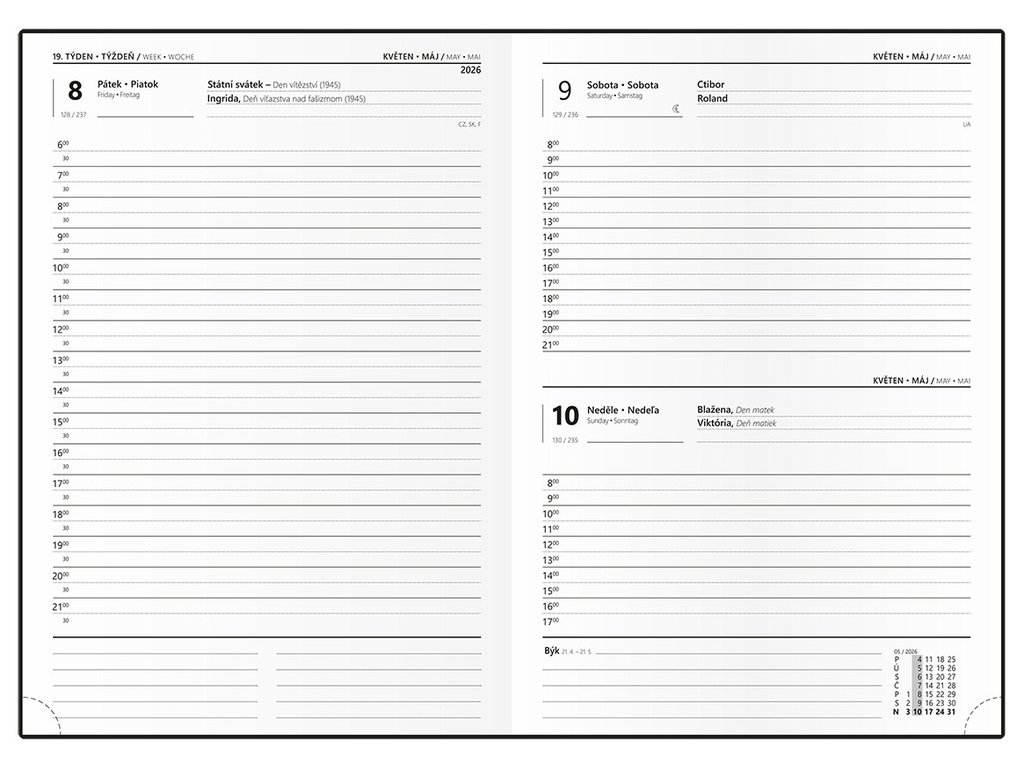 plnobarevné diáře potažené nepoškrabatelným matným laminem s parciálním lakem, rovný hřbet, české a slovenské jmenné kalendárium, mezinárodní svátky, místo na poznámky, peroforované rožky, formát 14,3 x 20,5 cmDoplňkové parametry