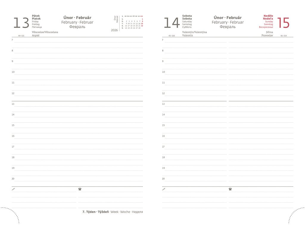 desky příjemné na dotek, speciální lamino s hedvábným efektem, osobní údaje, měsíční přehled, státní svátky, mezinárodní svátky, adresář, mapa, formát 14,5 x 20,5 cmDoplňkové parametry