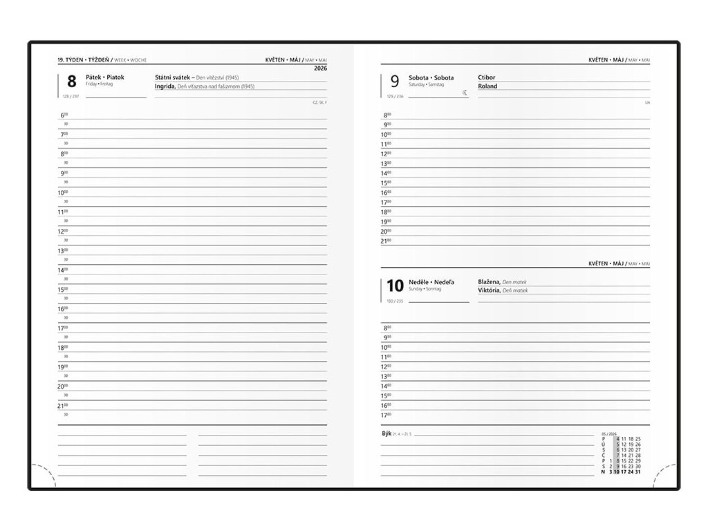 jemný hladký materiál s ražbou po celé ploše diáře, doplněný o gumičku v barvě diáře, poutko na propisku, české a slovenské jmenné kalendárium, mezinárodní svátky, měsíční fáze, roční období, letní a zimní čas, místo na poznámky, daňové termíny, formát 12 x 16,5 cmDoplňkové parametry