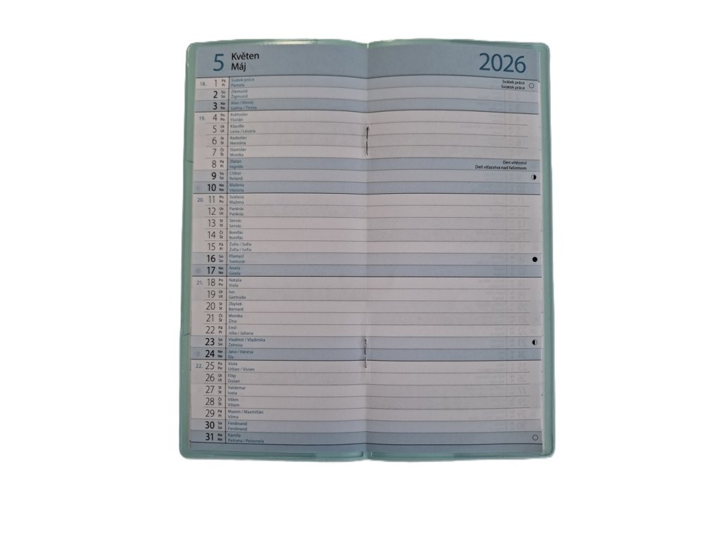 materiál PVC, české měsíční jmenné kalendárium, měsíční fáze, roční období, letní a zimní čas, osobní záznamy, plánovací kalendář, místo na poznámky, přehled státních svátků, formát 7,7 x 17,8 cmDoplňkové parametry