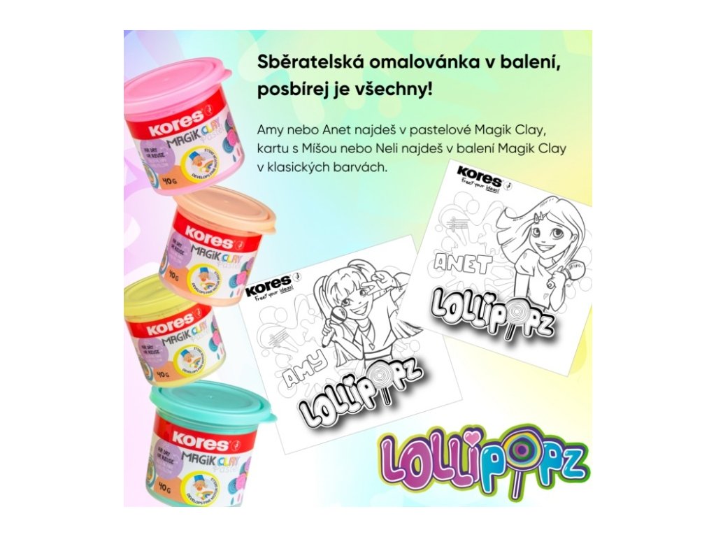 modelovací hmota v limitované kolekci LOLLIPOPZ, neobyčejná, odlehčená, tvárná hmota v kelímkách, sada 4 pastelových barev po 40 g, snadno míchatelné, není nutné pečení, na vzduchu po 24 h ztvrdne, poté lze dekorovat, při uskladnění ve vzduchotěsném obalu může být znovu použita, před ztvrdnutím je pružná a skáče - lze vyrobit Hopíka, netoxická, SOUČÁSTÍ BALENÍ JSOU SBĚRATELSKÉ KARTY / OMALOVÁNKY LOLLIPOPZ, V TÉTO VERZI S AMY A ANETDoplňkové parametry