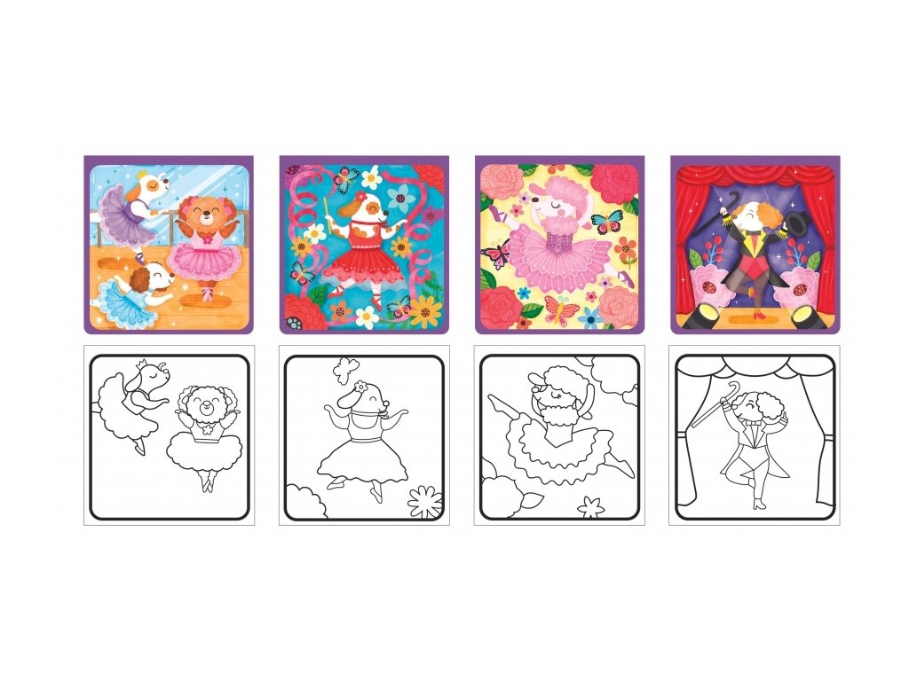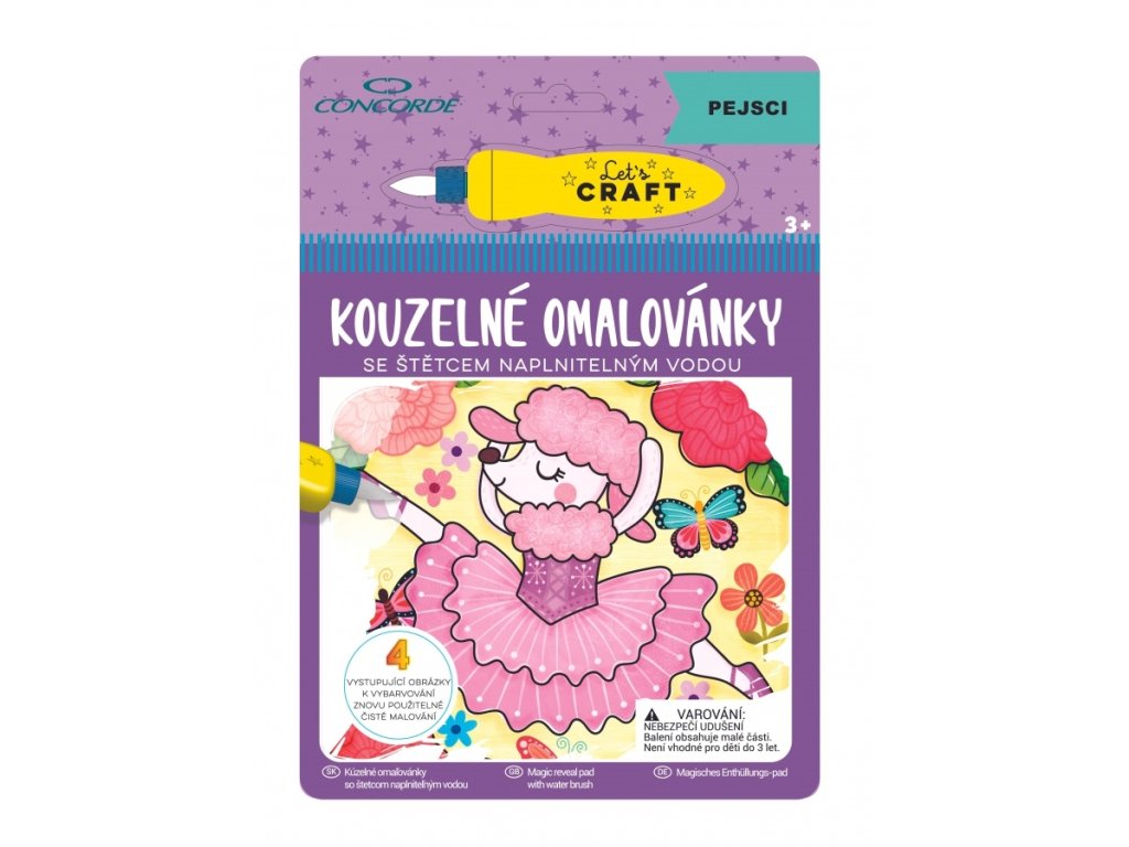 kouzelné omalovánky disponují čtyřmi obrázky, štětec se naplní vodou a po rozetření vody na bílou plochu obrázky získají barvu, po vybarvení se omalovánky nechají uschnout a po úplném uschnutí jsou znovu použitelné, balení obsahuje: 4 znovupoužitelné obrázkové plochy z tvrdého kartonu a speciální vodou plnitelný štětecDoplňkové parametry