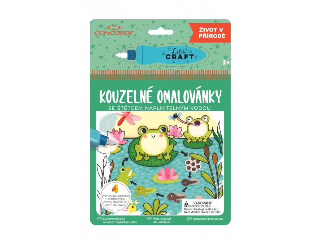 kouzelné omalovánky disponují čtyřmi obrázky, štětec se naplní vodou a po rozetření vody na bílou plochu obrázky získají barvu, po vybarvení se omalovánky nechají uschnout a po úplném uschnutí jsou znovu použitelné, balení obsahuje: 4 znovupoužitelné obrázkové plochy z tvrdého kartonu a speciální vodou plnitelný štětecDoplňkové parametry