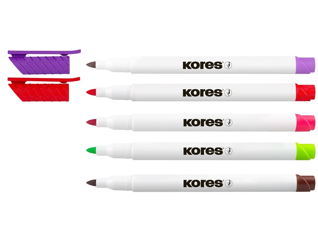 vysoce kvalitní tenké popisovače na bílé tabule nebo dětské tabulky s jemným hrotem, rychle zasychají, netoxické, bez xylenu, toluenu a benzenu, může být použit na sklo a jiné neporézní povrchy, snadno smazatelné z bílých tabulí i za sucha bez zanechání stop, živé a neprůsvitné barvy na všech typech bílých tabulí, hladký a moderní design s Kores víčkemDoplňkové parametry