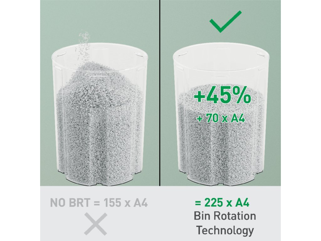 Skartovačka Leitz IQ OptiMax pro domácí kanceláře poskytuje vysoce výkonné skartování díky jedinečné technologii rotace koše (Bin Rotation Technology - BRT), která zvyšuje kapacitu koše o 45 % (o 70 listů A4 více), koš není potřeba tak často vysypávat. Tato skartovačka s mikrořezem a stupněm zabezpečení DIN P5 skartuje až 6 listů A4 najednou, přičemž 15litrový koš pojme až 225 listů - ideální pro efektivní každodenní domácí skartování. Rozměr: 332 × 573 × 314 mmDoplňkové parametry