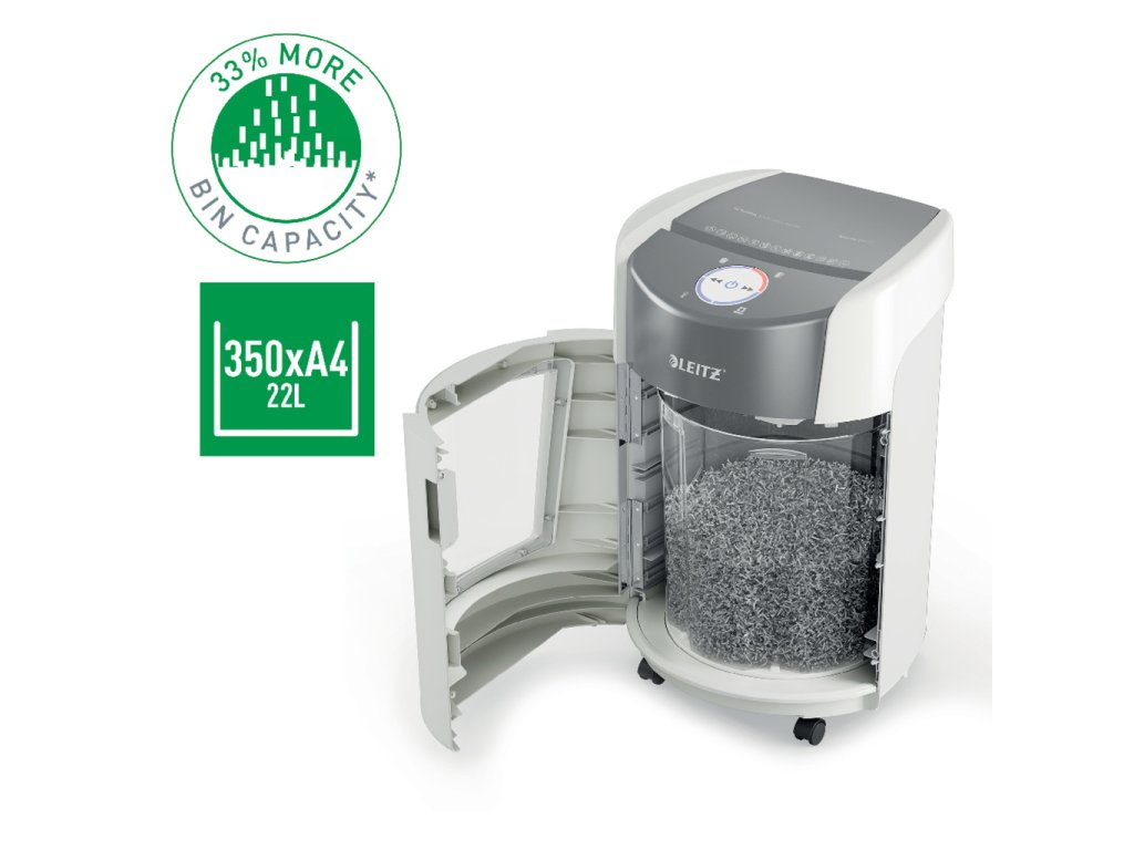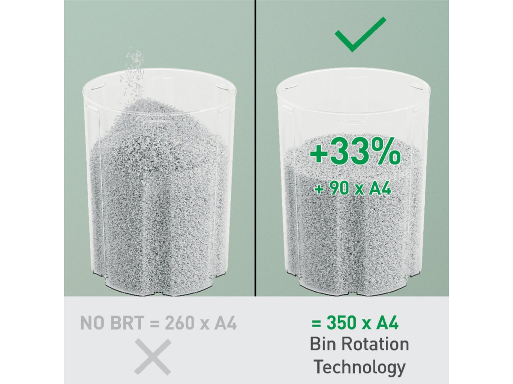 Malý kancelářský skartovač Leitz IQ OptiMax nabízí velmi výkonné skartování a díky jedinečné technologii rotace koše (Bin Rotation Technology - BRT), která zvyšuje kapacitu koše o 33 % (cca o 90 listů A4 více), není nutné tak často vysypávat koš. Skartovačka s mikrořezem má zabezpečení DIN P5, dokáže najednou skartovat až 8 listů A4 (80 g/m2). Koš o objemu 22 l pojme až 350 listů - ideální pro efektivní a vysoce bezpečnou skartaci. Rozměr: 384 × 630 × 392 mmDoplňkové parametry