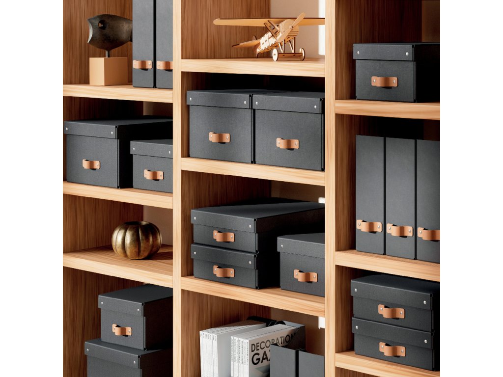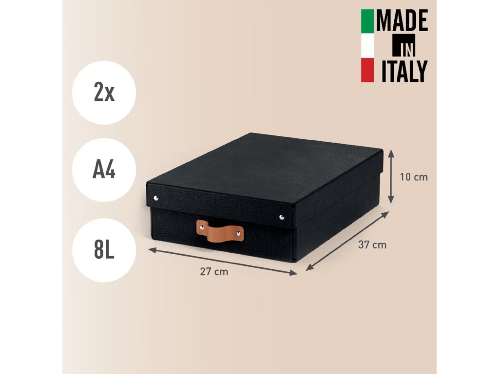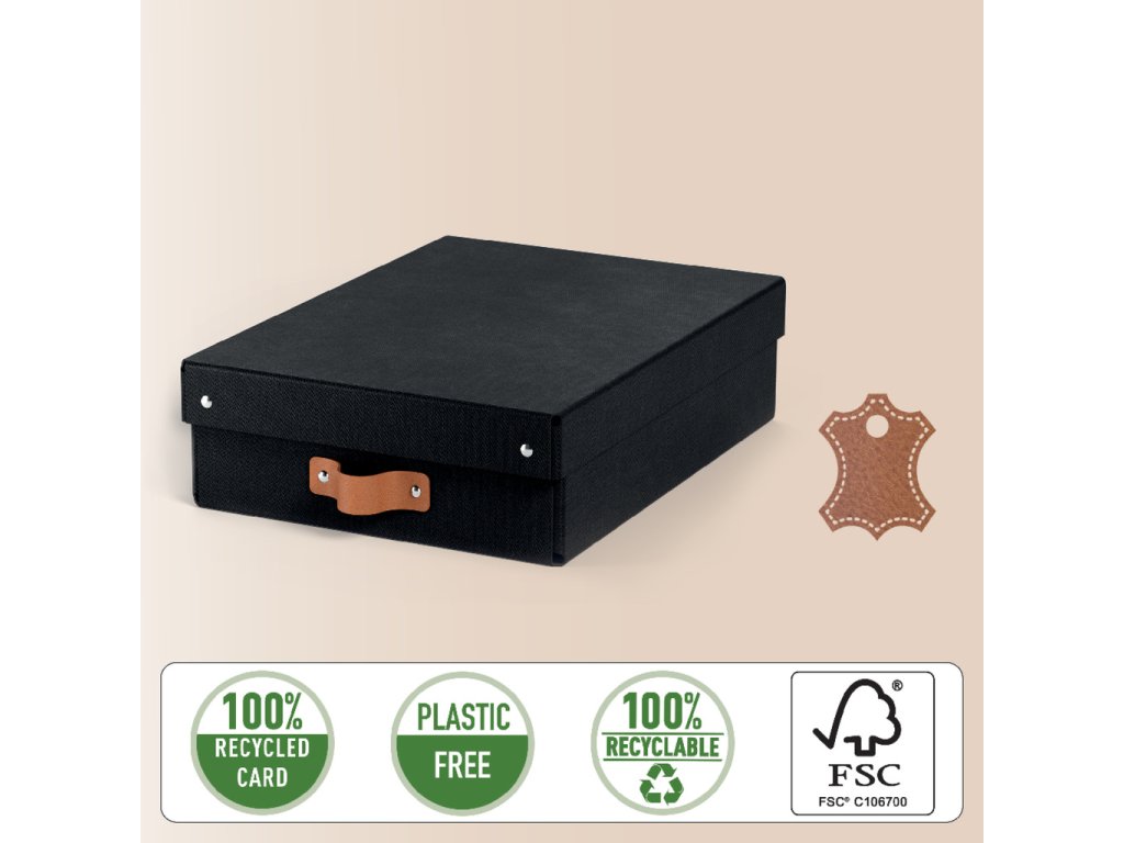 Sada dvou středních, nízkých kartonových krabic s víkem. 8L. Snadno sestavitelný úložný box na dokumenty A4 a další předměty. 100% recyklovaný karton. Rozměr: 270 × 100 × 370 mm.Doplňkové parametry