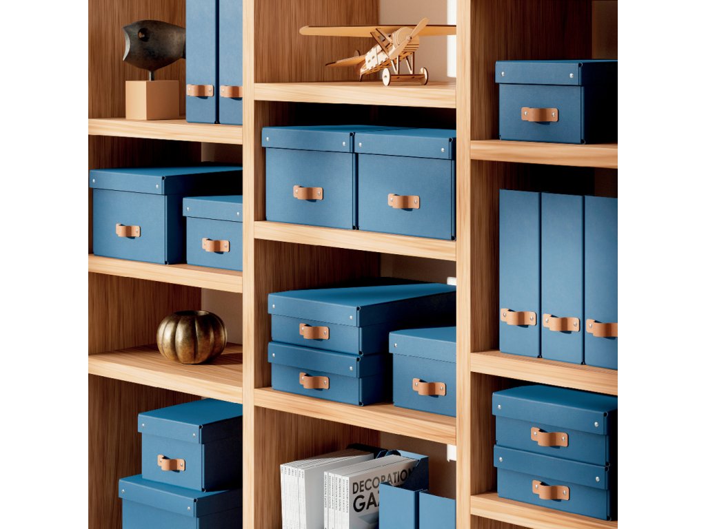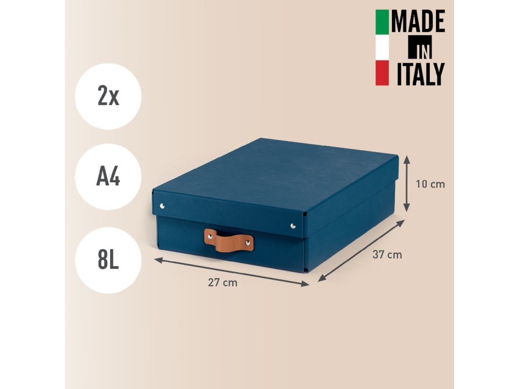 Sada dvou středních, nízkých kartonových krabic s víkem. 8L. Snadno sestavitelný úložný box na dokumenty A4 a další předměty. 100% recyklovaný karton. Rozměr: 270 × 100 × 370 mm.Doplňkové parametry